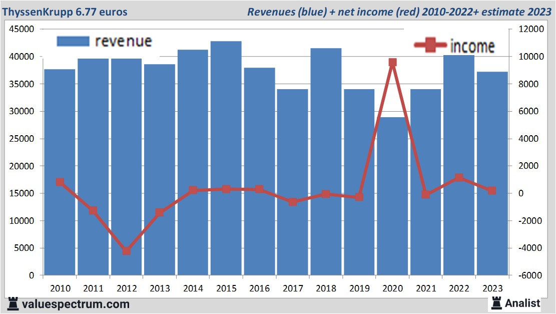 Morgen zal het Duitse ThyssenKrupp haar resultaten over het afgelopen kwartaal bekend maken. Over 2023 komt de omzet van het bedrijf uit volgens de analisten uit op 37.26 miljard euro. Dit is vrij beperkt minder dan de omzet over 2022 toen het concern 41.14 miljard euro verdiende.