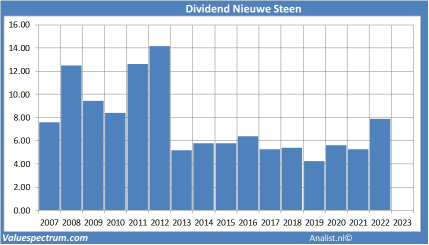 Beziters van aandelen Nieuwe Steen kunnen vemoedelijk een forse dividenduitkering verwachten. Per aandeel richten de analisten op een dividendbetaling van 1.46 euro. Het dividendrendement komt hiermee uit op 7.87 procent. Het doorsnee dividendrendement van de vastgoedsector ligt op een zeker aantrekkelijke 5.34 procent.
