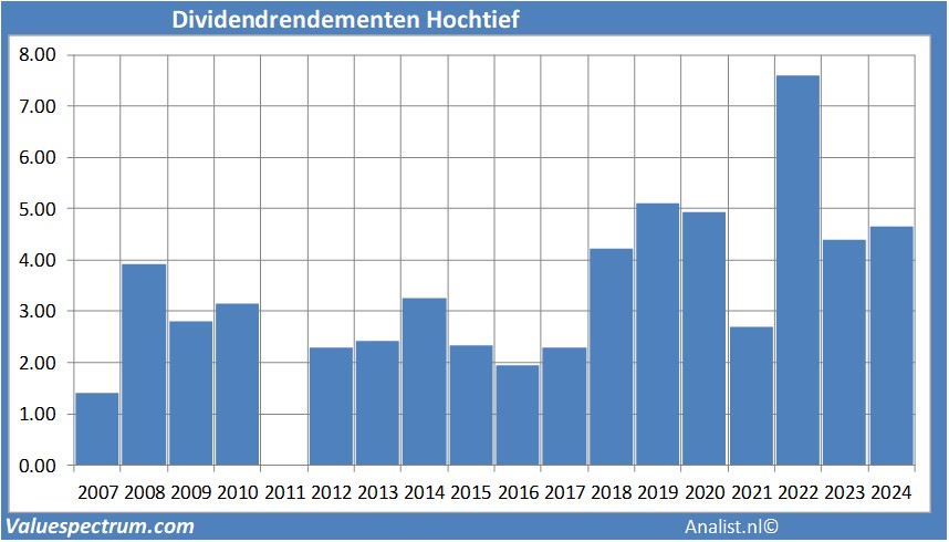 Houders van het aandeel Hochtief hebben uitzicht op een aanzienlijke dividenduitkering. Gezien de gemiddelde analistentaxatie wordt het aandeel Hochtief nu één van de hoogste dividendrendementen van de Duitse beurs verhandeld. Over dit jaar bedraagt de gemiddelde verwachting van de dividenduitbetaling op 4.78 euro. Hochtief 's dividendrendement komt hiermee uit op 4.66 procent. Het gemiddelde dividendrendement van de bouw- en infrastructuursector ligt op een royale 2.73 procent.