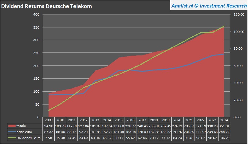 De uitgekeerde dividenden over de afgelopen jaren zijn met gemiddeld 4.82 per jaar behoorlijk te noemen. De beleggers die sinds 2008 hun aandelen hebben aangehouden staat nu op een winst van 47 procent. Het totale dividendrendement vanaf 2008 komt neer op 114 procent. De impact van de ontvangen dividenden op het totale rendement is dus voor de buy & hold belegger vrij dominant.