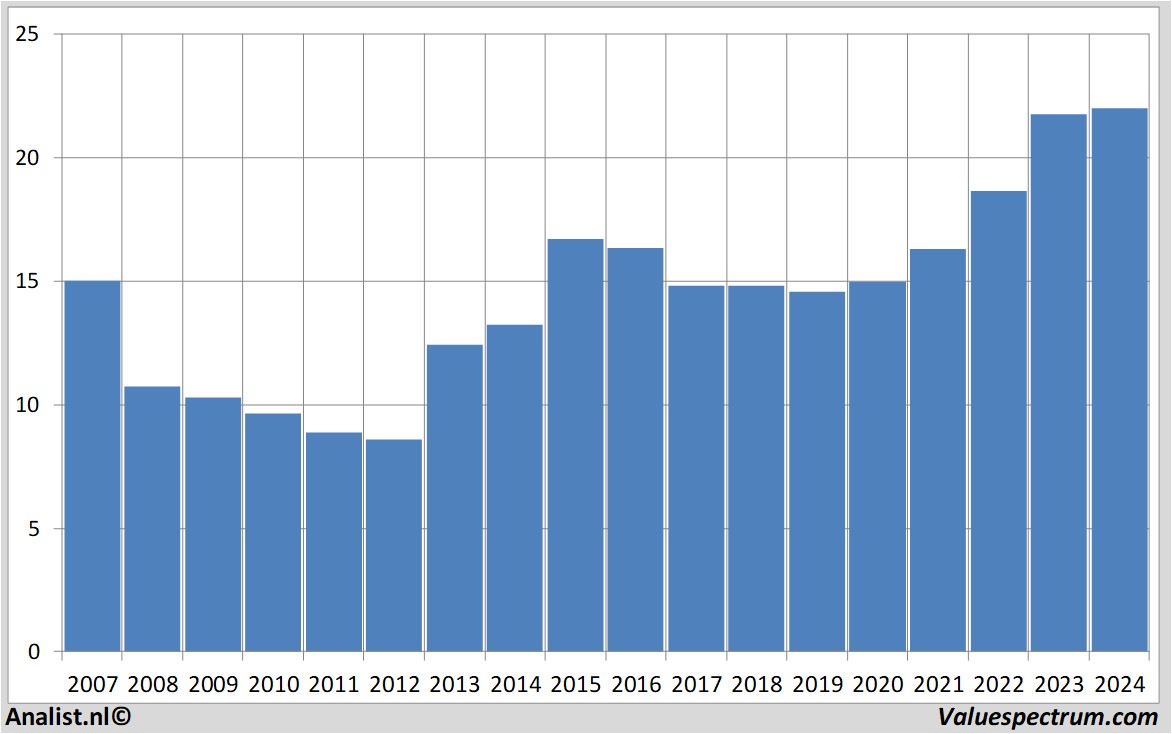 De analisten rekenen voor 2024 op een nettowinst van 8.87 miljard euro. Over dit jaar wordt door het gros van de analisten een winst per aandeel van 1.8 euro verwacht. Op basis hiervan komt de koerswinstverhouding uit op 12.23.