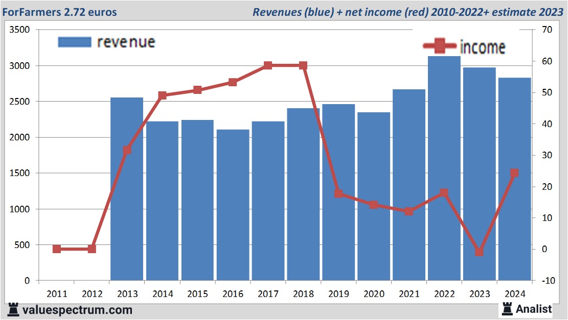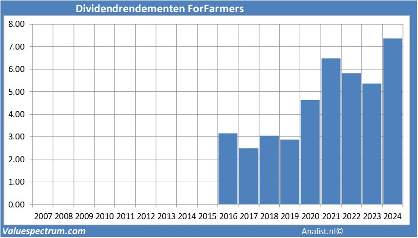 Het lijkt er op dat beleggers in het aandeel ForFarmers vermoedelijk kunnen rekenen op een aanzienlijk dividend. Baserend op het gemiddelde van de analistenmeningen heeft het aandeel ForFarmers nu één van de hoogste dividendrendementen van de Nederlandse beurs. Per aandeel wordt door de analisten een een dividend; van 20 cent verwacht. ForFarmers 's dividendrendement komt dan ongeveer uit op 7.35 procent.Het doorsnee dividendrendement van de voedingsbedrijven ligt op een aantrekkelijke 3.08 procent.