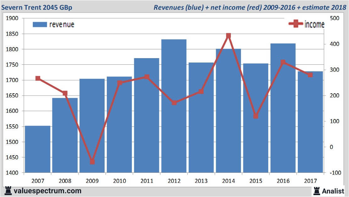 Morgen zal het Engelse Severn Trent met haar resultaten over het afgelopen kwartaal komen. Over dit jaar komt de omzet volgens de analisten uit op 1,73 miljard GBp. Dit is licht minder dan de omzet over 2017 toen het concern 1,82 miljard GBp verdiende.