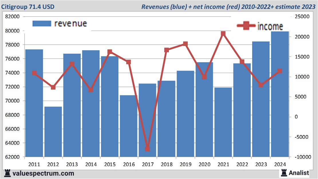 Morgen gaat Citigroup haar resultaten over het afgelopen kwartaal naar buiten brengen. Volgens de meest recente rondvraag aan de analisten komt de totale omzet van het bedrijf uit New York dit jaar uit op 80.96 miljard dollar. Dit is beperkt meer dan de omzet over 2023 toen het bedrijf 78.47 miljard dollar binnen kreeg.