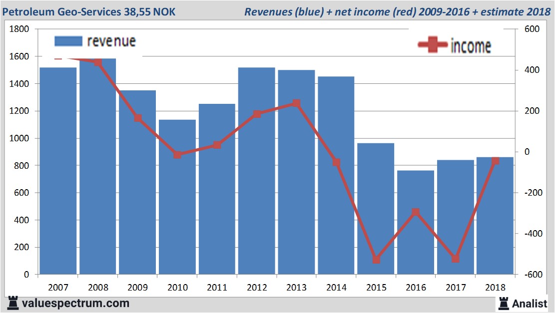 Petroleum Geo-Services publiceert morgen haar resultaten over het afgelopen kwartaal. Over 2018 komt de omzet volgens de analisten uit op 862,91 miljoen NOK. Dit is vrij beperkt meer dan de omzet over 2017 toen het concern 838,8 miljoen NOK verdiende.