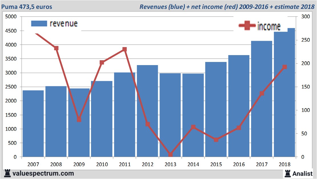 Over dit jaar ligt de verwachting van het dividend op 3,45 euro. Puma 's dividendrendement is dus 0,73 procent. Het doorsnee dividendrendement van de algemene detailhandel ligt op een nihile 0,5 procent.