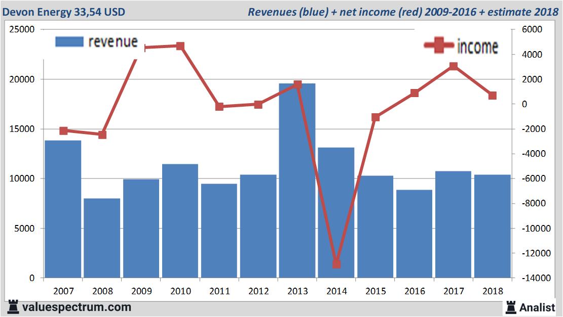 Morgen gaat Devon Energy haar resultaten over het afgelopen kwartaal naar buiten brengen. Over het huidige boekjaar komt de omzet volgens de analisten uit op 10,4 miljard dollar. Dit is vrij beperkt minder dan de omzet over 2017 toen het concern 10,73 miljard dollar verdiende.