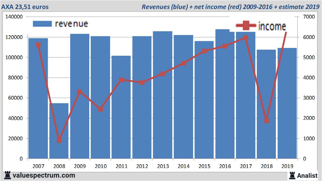 AXA's marktkapitalisatie bedraagt op basis van het aantal uitstaande aandelen maal de beurskoers ruim 56,03 miljard euro. Het aandeel AXA was de afgelopen 12 maanden vrij bewegelijk. Sinds een jaar terug staat het aandeel AXA 19 procent in de plus. Het aandeel koerste het laatste jaar tussen de 18 en de 24 euro.