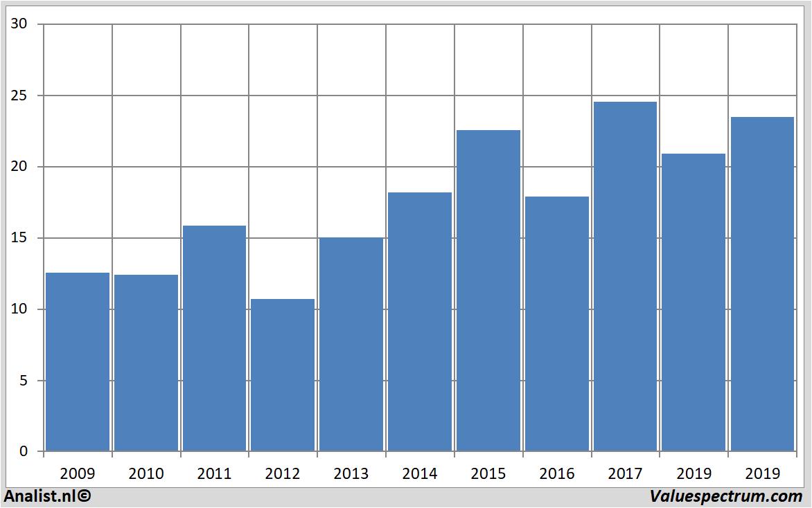 De analisten gaan voor 2019 uit van een nettowinst van 6,49 miljard euro. Volgens de jongste analistenconsensus houdt het bedrijf over dit jaar een winst per aandeel van 2,76 euro over. Op basis hiervan komt de koerswinstverhouding uit op 8,52.