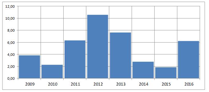 Per aandeel verwachten de analisten een dividend van 0,1 cent. Het dividendrendement van Mota Engil ligt hiermee op 6,21 procent. Het gemiddelde dividendrendement van de bouw- en infrastructuurbedrijven ligt op een nihile 1,81 procent.Over het lopende jaar ligt de consensus van de omzet op 2,34 miljard euro. Dit is licht minder dan de omzet over 2015 toen de omzet 2,43 miljard euro bedroeg.