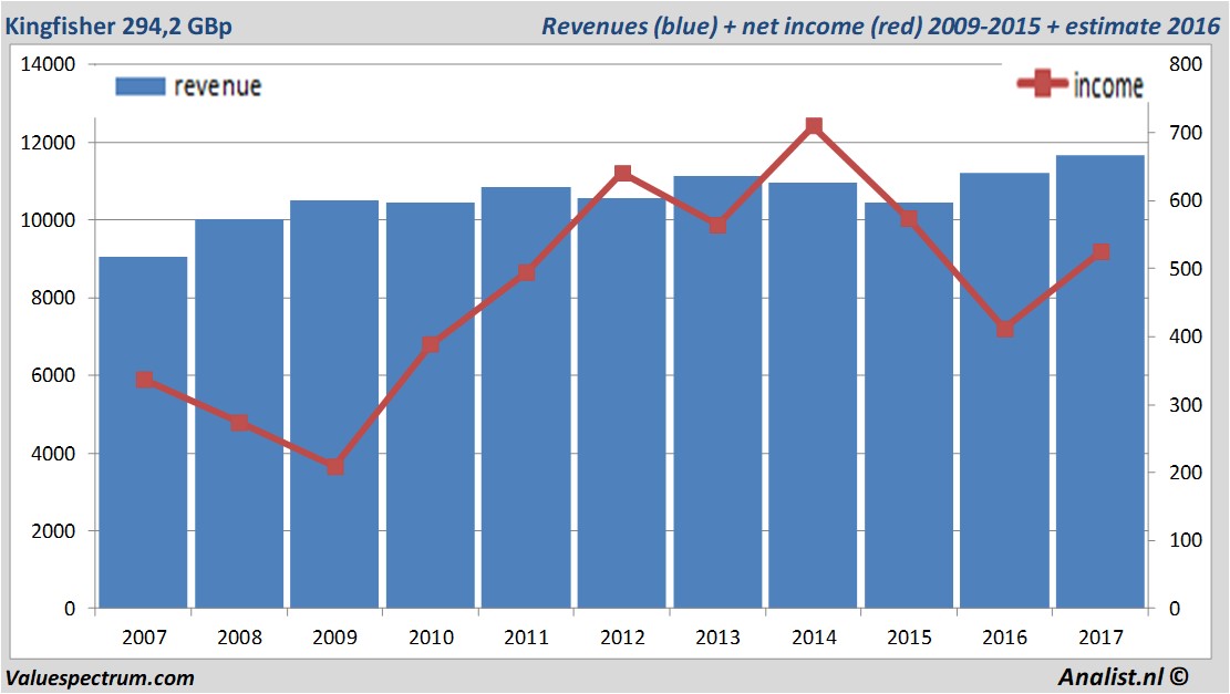 Morgen komt het Engelse Kingfisher met haar resultaten over het afgelopen kwartaal. Over het lopende jaar ligt de consensus van de omzet op 11,67 miljard GBp. De omzet zou volgens de analisten dit jaar dan het hoogste in haar historie zijn. Dit is licht meer dan de omzet over 2016 toen het bedrijf 11,23 miljard GBp verdiende.