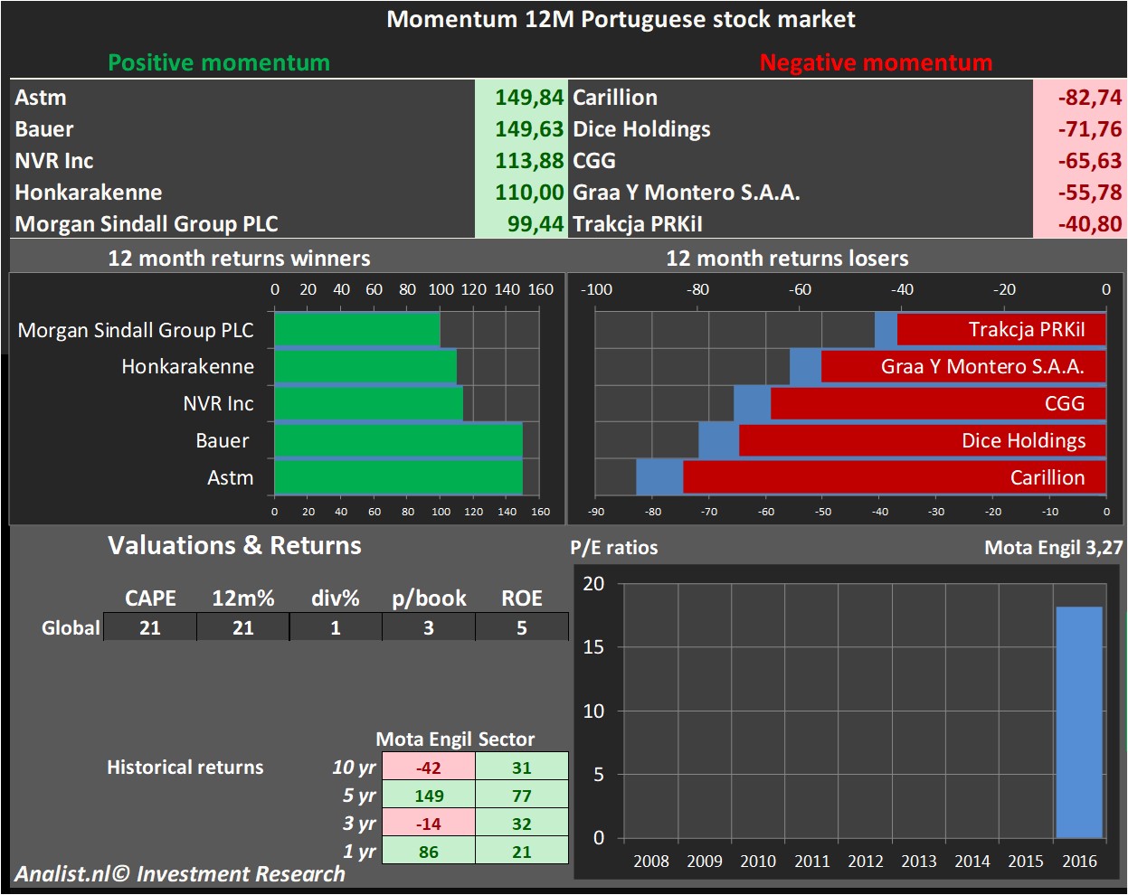 Buy & hold rendementen aandeel Mota Engil over diverse periodes, exclusief dividendrendementen