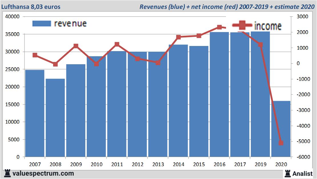 De analisten rekenen voor 2020 op een nettoverlies van 5,1 miljard euro. Over dit jaar ligt de consensus van Lufthansa 's resultaat per aandeel op een verlies van 9,79 euro. De koers-winst-verhouding ligt hiermee op -0,82.