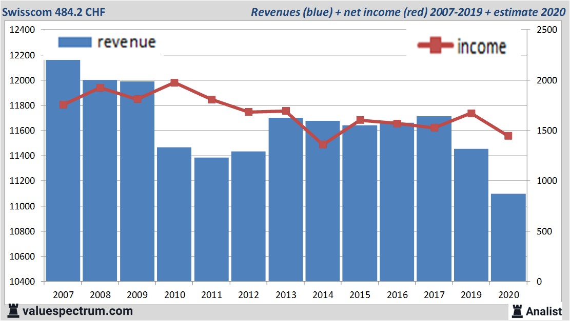 De analisten gaan voor 2020 uit van een nettowinst van 1.45 miljard CHF. Over dit jaar ligt de consensus van Swisscom 's resultaat per aandeel op een winst van 27.8 CHF. De koers/winstverhouding komt hiermee op 17.42 te liggen.