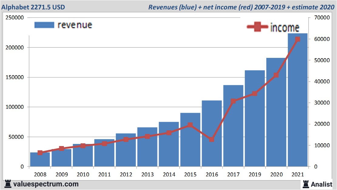 Over 2021 verdient het bedrijf uit Mountain View volgens de gepolste analisten uit op 236.97 miljard dollar. Dit is behoorlijk meer dan de omzet over 2020 toen de omzet 182.53 miljard dollar bedroeg.