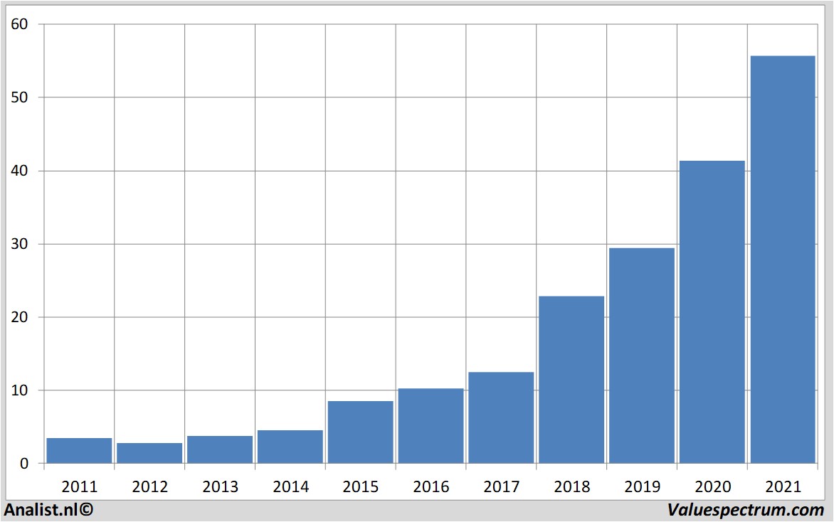 De analisten gaan voor 2021 uit van een nettowinst van 1.1 miljard euro. Over dit jaar houdt het bedrijf volgens de analisten een winst per aandeel van 1.42 euro over. Op basis hiervan komt de koerswinstverhouding uit op 39.24.
