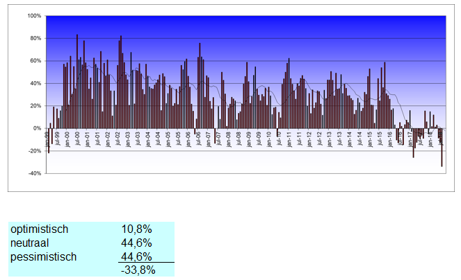 Voor het komende halfjaar is netto ook hetzelfde percentage somber. Dat klinkt niet bijzonder, maar dat is het wel. Voor de lange termijn zijn de experts nog niet eerder zo somber geweest. Dat is goed in de grafiek terug te zien. Slechts 11% verwacht dat de beurs gaat stijgen met meer 6% in de komende 6 maanden. In de eerste van 2018 heeft u met de AEX bijna niets verdient, en volgens de professionals gaat dat in de rest van het jaar niet veel beter worden.